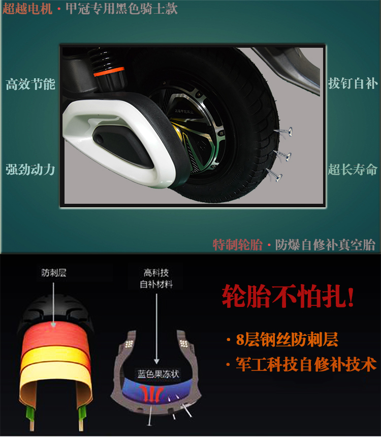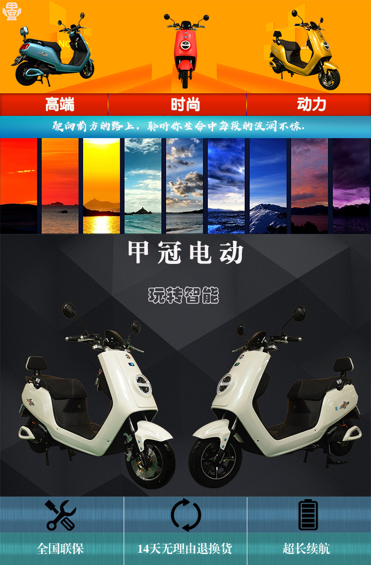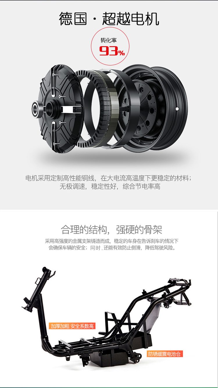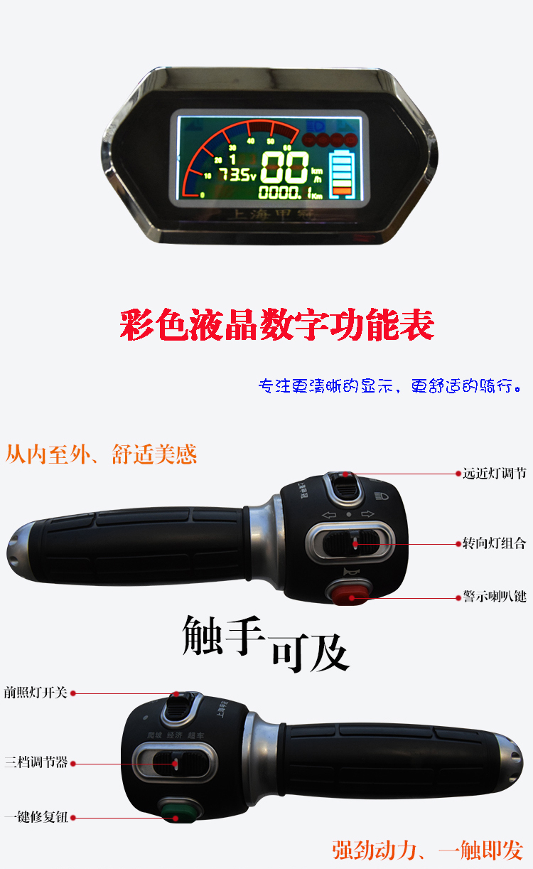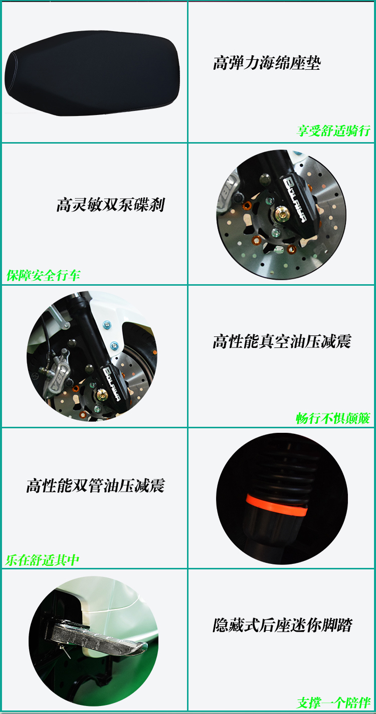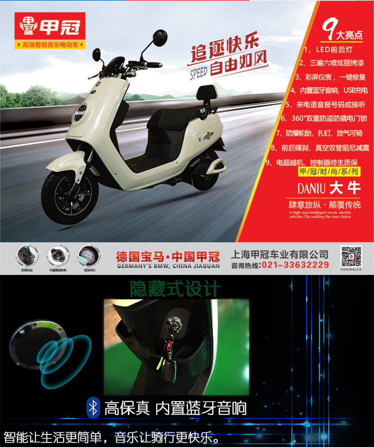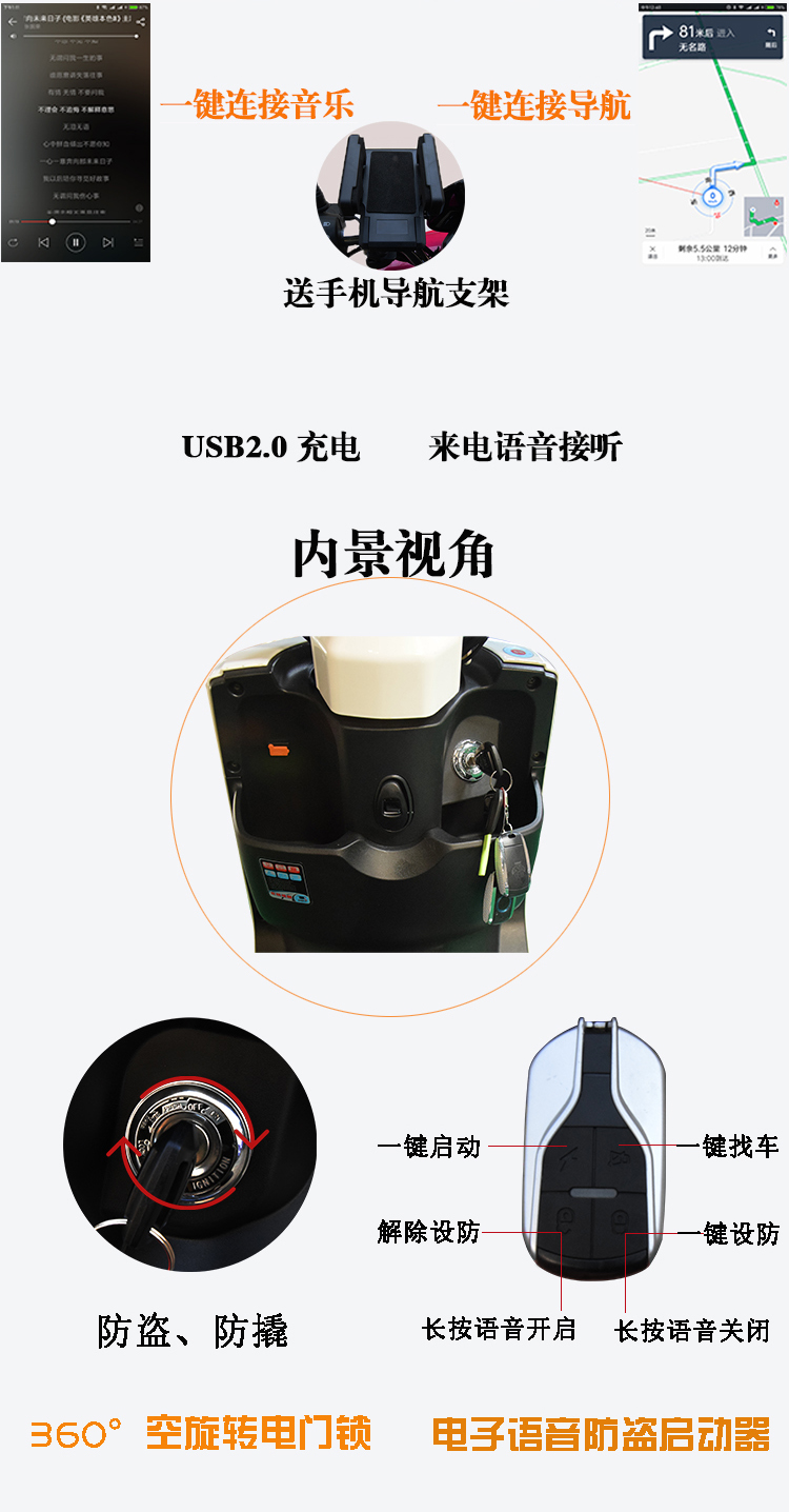智能系统+产品亮点: USB充电、故障自检修复、语音报警防盗、 蓝牙音响、导航 360度空旋转电门锁防盗、 LED前后灯、